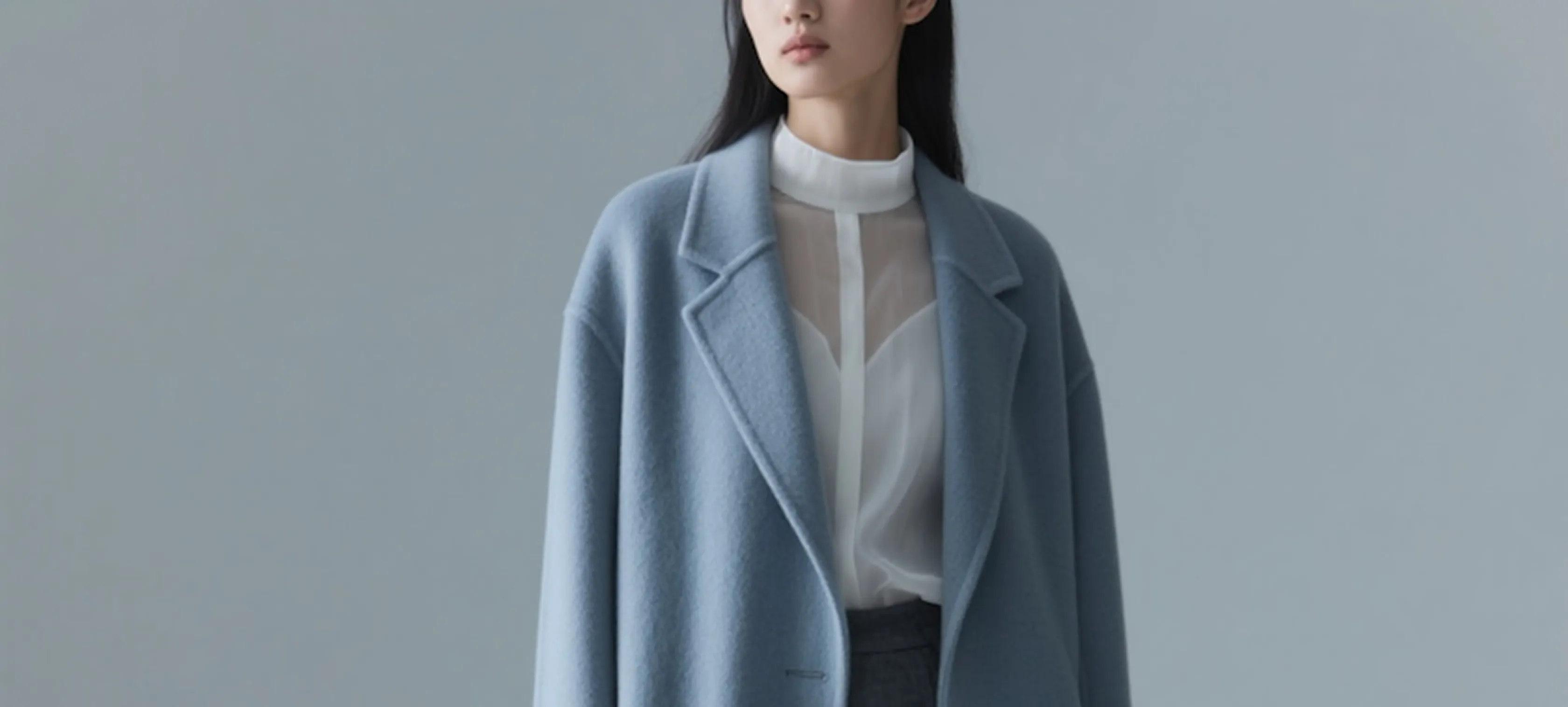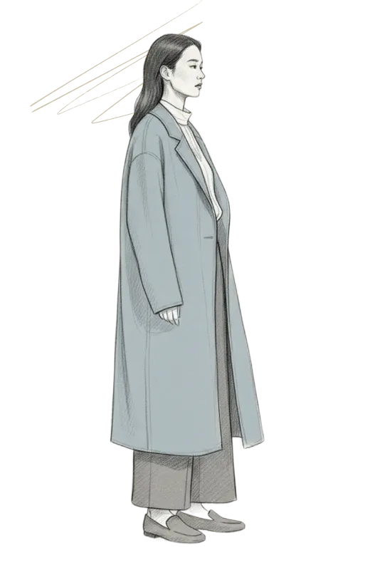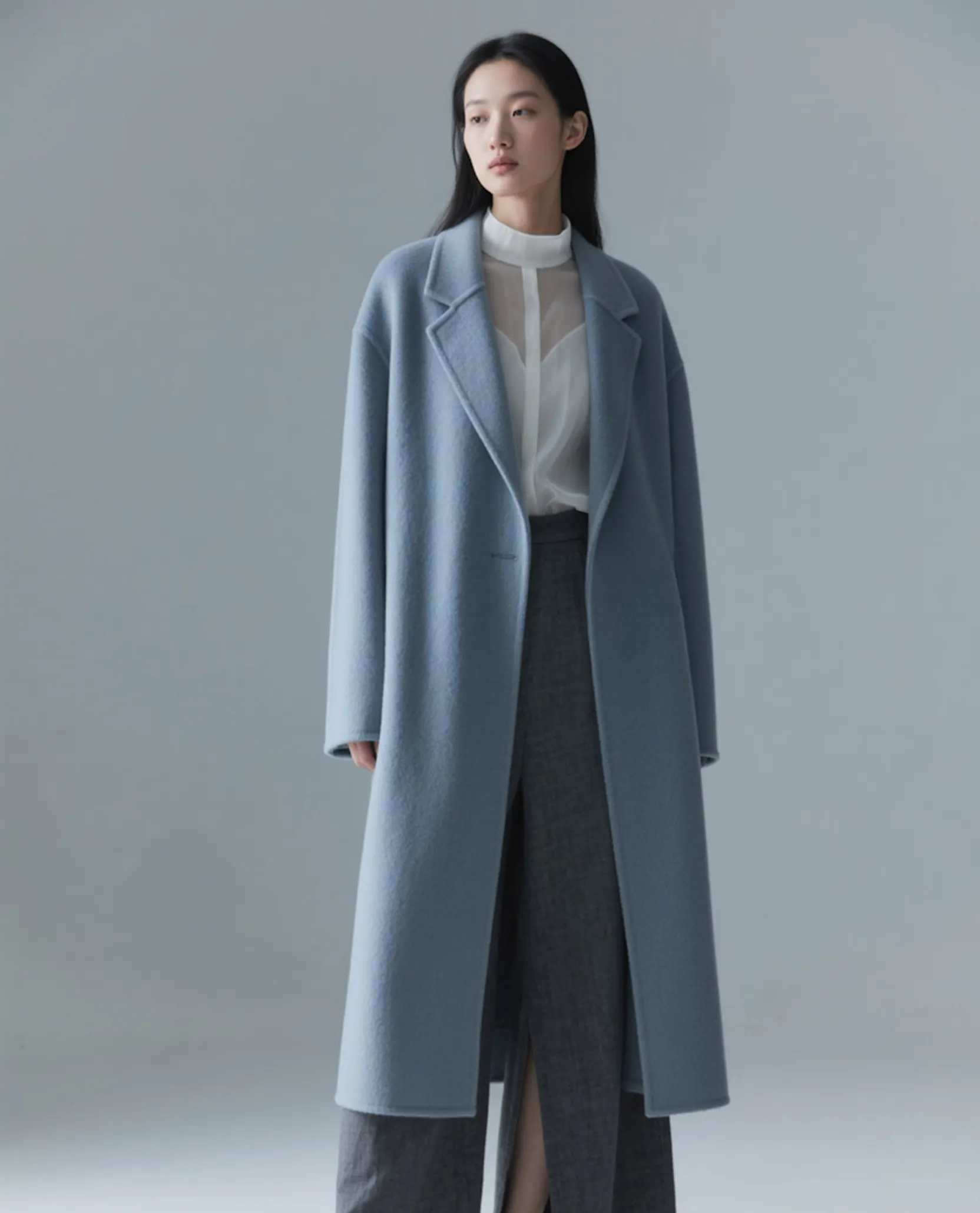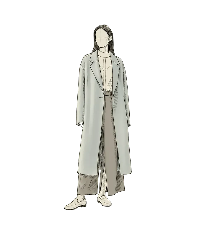 A blend of sharp tailoring and soft textures, this outfit features a crisp white dress and an elegant overcoat, ideal for a sophisticated statement.
